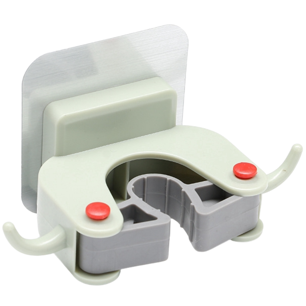 Get your cleaning gear organised with this adhesive broom holder! Mount it on a wall to hang your broom or mop up for easy access.